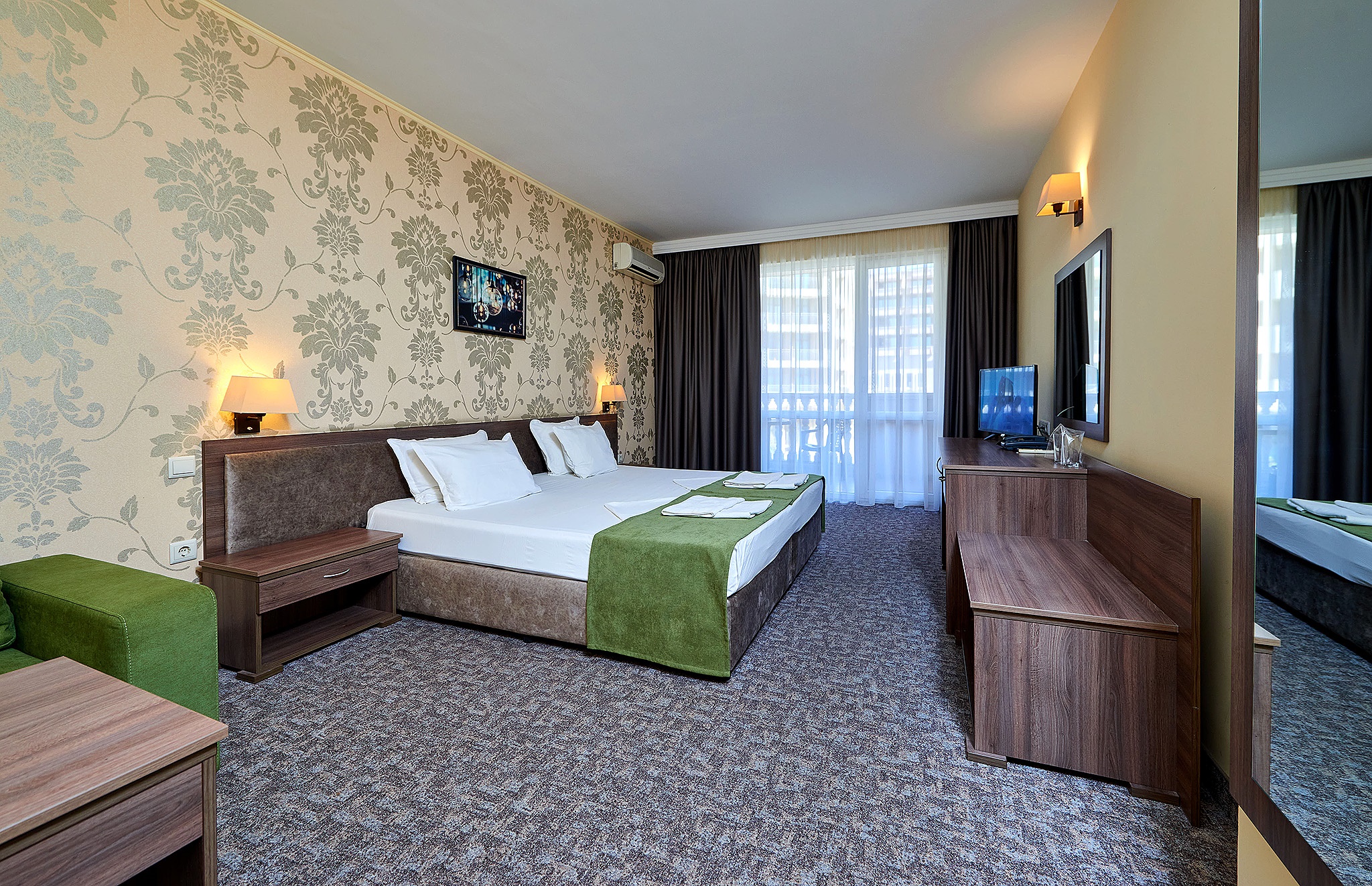 В стите: климатик, телевизор, хладилник, кът за сядане, сейф , баня с душ кабина,тоалетни принадлежности и сешоар,