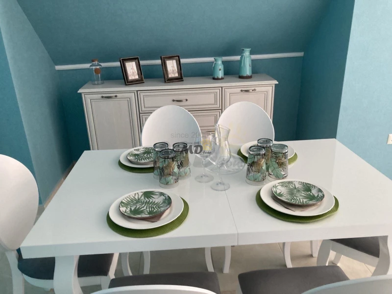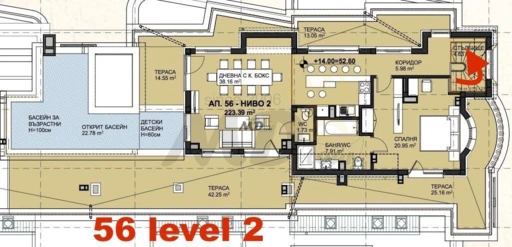 2 ниво – коридор, тоалетна, просторна дневна с кухненски бокс, две спални и просторен панорамен балкон с частен басейн.