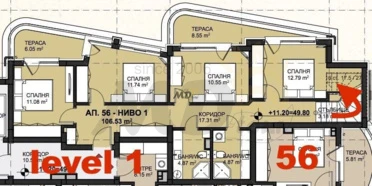 1 ниво – коридор, две бани с тоалетни, четири спални и два балкона.
